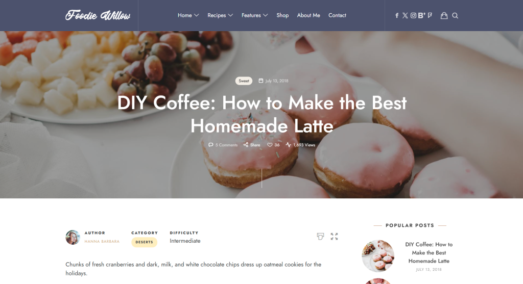 The food blog theme shines in flexibility and customization, giving you full control over your site’s appearance and structure without coding. It lets you choose from multiple post types — standard, gallery, video, quote — so you can publish recipes, photo essays, or cooking videos with ease. The theme also includes customizable headers and footers, unlimited color schemes, Google Fonts support, social sharing integration, and various layout options (grid, masonry, list). With built-in features like a mega-menu, custom widgets (for Instagram feed, popular posts, etc.), and compatibility with major WordPress plugins, Paperio offers a robust foundation to build a unique and professional food blog that stands out.