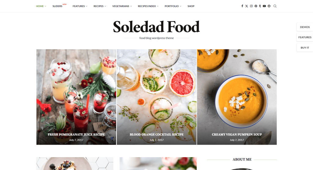 The theme is packed with features like a recipe index template that makes it easy to organize and showcase your recipes, responsive design, powerful customization options which allows you to create a unique look for your site, an Instagram feed widget to help you promote your photos, and so much more. Soledad is another brilliant WordPress theme designed for food blogs. This theme is perfect for food bloggers who want to showcase their recipes and photos in a stylish way. With its clean design and powerful features, Soledad is sure to make your food blog stand out from the crowd.
